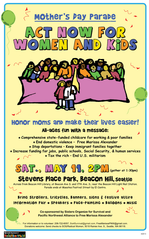 Sisters Organize for Survival (SOS) is mobilizing parents, feminists and concerned activists to build a movement for comprehensive, state-funded childcare for all who need it. Affordable childcare is a necessity for poor and working families to survive, yet it is unaffordable or unavailable for tens of thousands of families in Washington State alone.